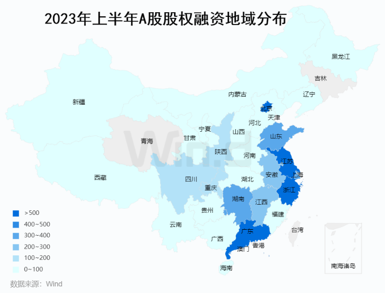 2023年上半年增发融资规模最高的区域为北京,15起项目募资金额963亿元,其中主要贡献是邮储银行和长江电力的增发项目。浙江和广东分别以329亿元和279亿元的募资额位居第二和第三,募资项目分别为17起和25起。上海以202亿元的募资金额位居第四,募资家数6起。湖南以150亿元的募资金额位居第五,募资家数9起。