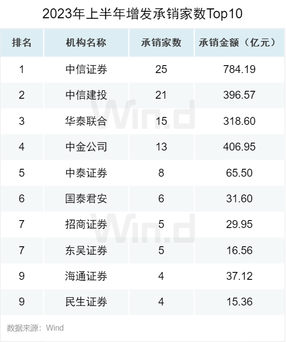 从增发承销数量来看,中信证券以25起承销数量位列第一。中信建投和华泰联合分别以21起和15起承销数量位居第二和第三。
