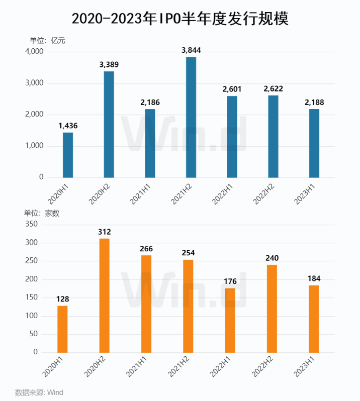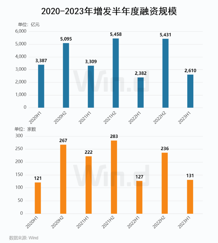Wind数据统计显示,2023年上半年中国内地股票市场包含IPO、增发和配股等多种方式在内的全口径募资事件共384起,较去年同期增加4起,合计募集资金达5,871亿元,同比下降15%。IPO及定增项目发行数量均略有增长,IPO发行184起,同比增加8起,IPO融资规模2,188亿元,同比下降16%。定增发行131起,同比增加4起,融资规模达2,610亿元,同比上升10%。