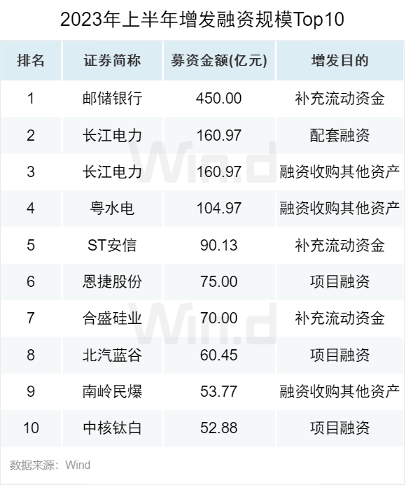 2023年度上半年,增发募资规模最大的项目为邮储银行,募资额高达450亿元,本次发行用于补充流动资金。排名第二的是长江电力,募资额达到322亿元,用于配套融资和融资收购其他资产。前十名募资项目中增发目的主要是补充流动资金、项目融资和融资收购其他资产。