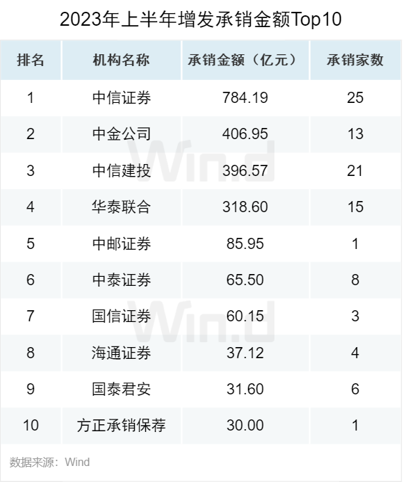 从增发承销金额来看,中信证券以784亿元的承销金额位居第一。中金公司以407亿元的承销金额位居第二,中信建投以397亿元的承销金额位居第三。华泰联合排名第四,承销金额为319亿元。
