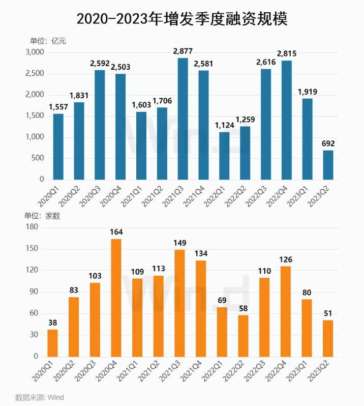 从增发融资近年趋势来看,2023年上半年增发整体融资规模高于去年同期,增发项目融资事件为131起,较去年同期增加4起;募集金额为2,610亿元,同比增长10%。其中,一、二季度增发项目分别为80起和51起,募资金额分别为1,919亿元和692亿元。