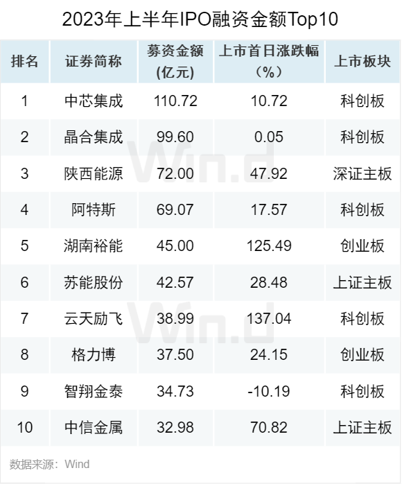 2023年上半年,IPO融资规模最高的为中芯集成,募资金额达111亿元。晶合集成与陕西能源分列第二和第三名,募资金额分别为100亿元72亿元。募资规模前十项目里,科创板占据5席。