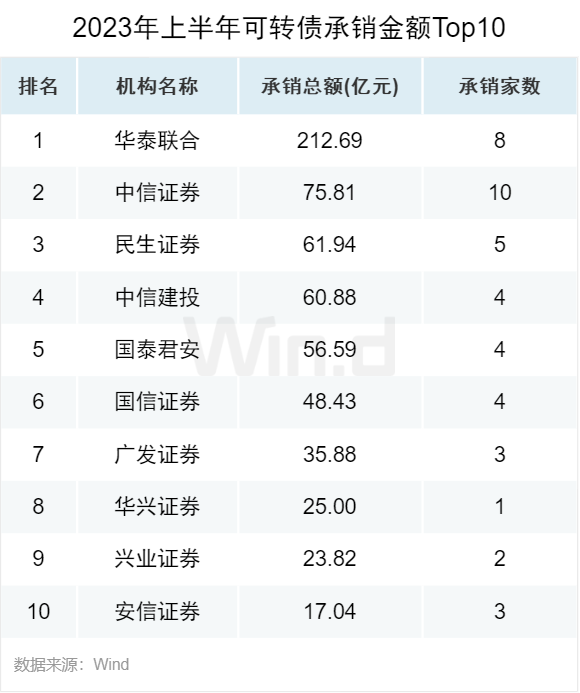 从可转债承销金额来看,华泰联合以213亿元的承销金额位居第一。排名第二和第三的分别是中信证券和民生证券,承销金额分别为76亿元和62亿元。