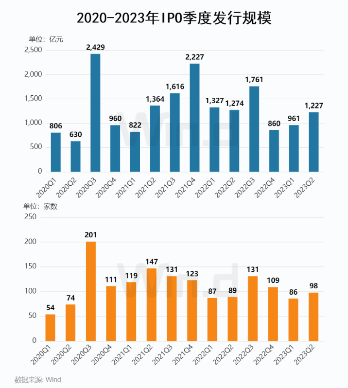 2023年上半年IPO发行184起,同比增加8起;募资规模为2,188亿元,较去年同期下降16%,环比下降20%。从季度分布来看,二季度IPO家数有所上升,一、二季度募资家数为 86 家和98家,募资金额分别为 961亿元和 1,227亿元。