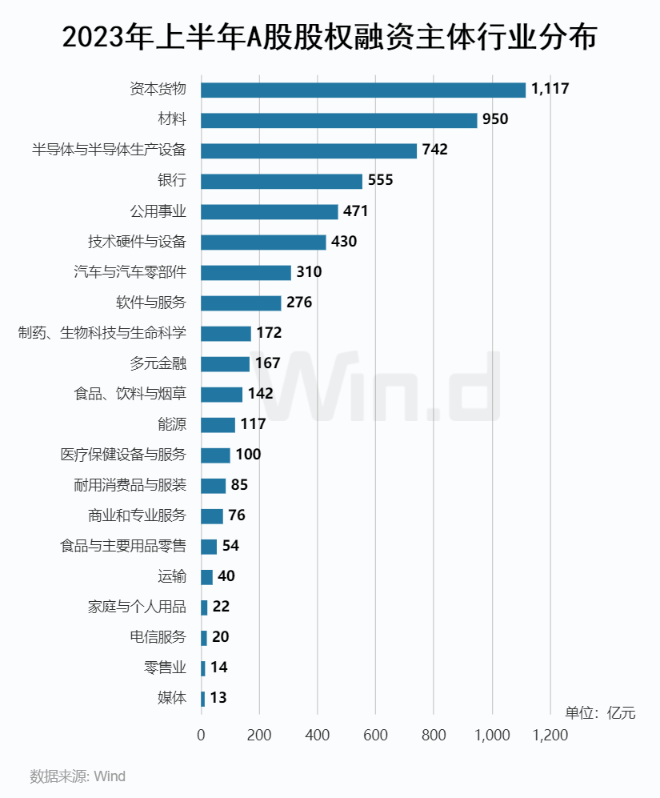 从各个行业的融资情况分布来看,资本货物行业以1,117亿元的募资金额位列第一,材料行业以950亿元的募资金额排名第二,半导体与半导体设备行业以742亿元的募资金额排名第三。银行业募资金额也超过500亿元,达到555亿元,位列第四名。
