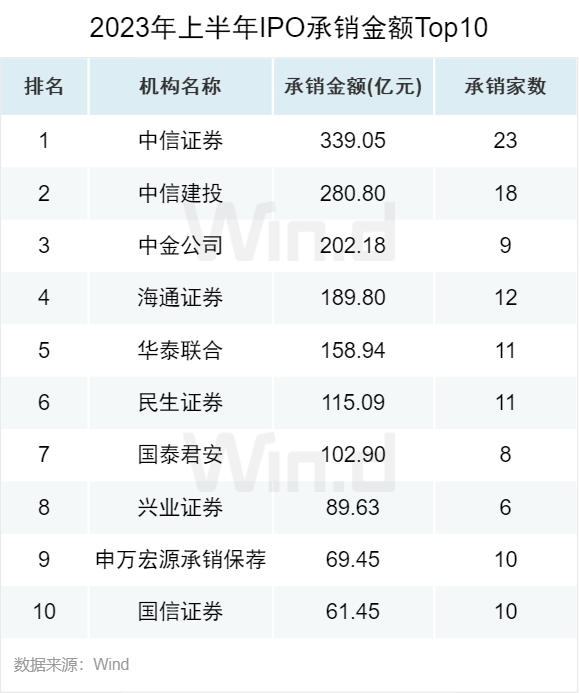 从IPO承销金额来看,中信证券以339亿元的承销金额稳居第一,排名第二和第三的分别是中信建投和中金公司,承销金额分别为281亿元和202亿元。海通证券和华泰联合位列第四名和第五名,承销金额分别为190亿元和159亿元。
