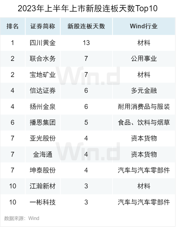 2023年上半年新股连板天数位居前三的为四川黄金、联合水务和宝地矿业,分别为13天、7天和7天。