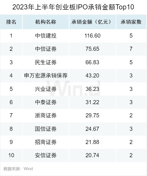 创业板IPO承销金额位居榜首的是中信建投,承销金额为117亿元,中信证券以76亿元的承销金额位居第二。位居三至五名的分别是民生证券、申万宏源承销保荐和兴业证券,承销金额分别为67亿元、43亿元和36亿元。