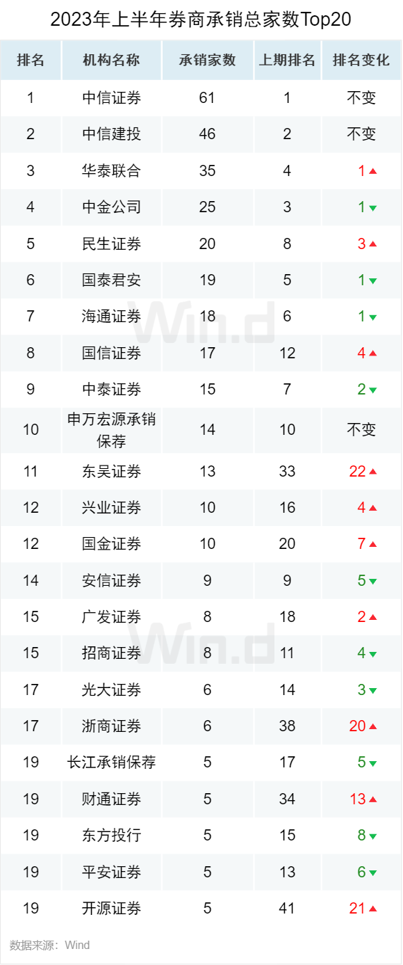 从券商承销数量来看,中信证券以61起承销数稳居榜单第一,中信建投以46起承销数排名第二,华泰联合以35起的承销数位居第三。中金公司和民生证券分别位居第四和第五,承销数分别为25起和20起。