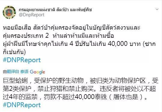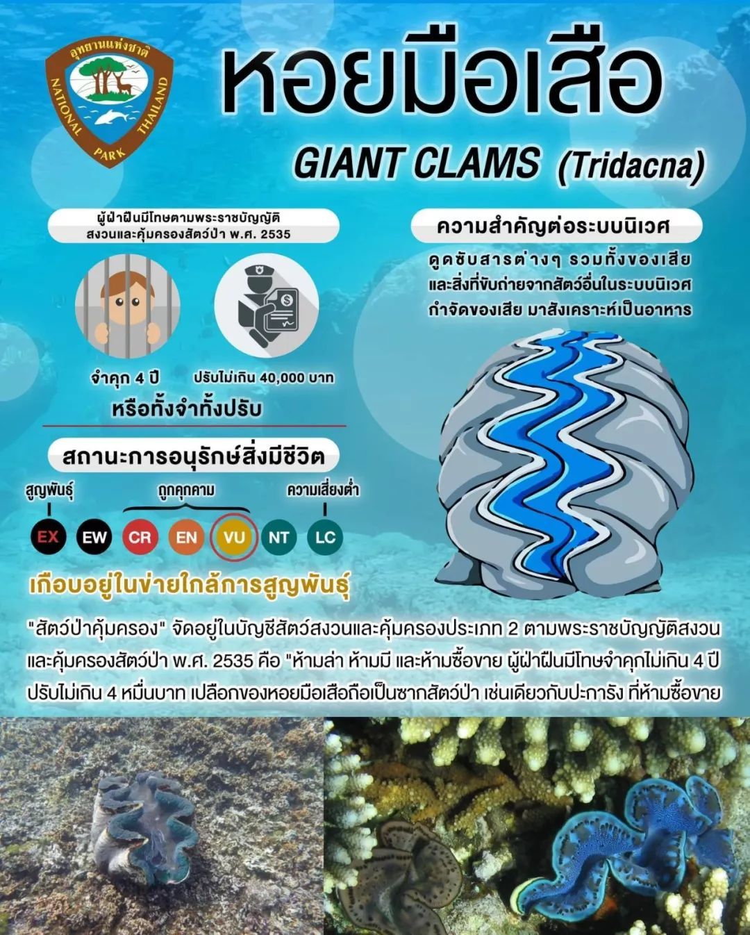 泰国农业暨合作部的公告规定,禁止抓捕或将哺乳类动物、珍稀或濒临灭绝的水生动物带上渔船,此份公告包括了砗磲。