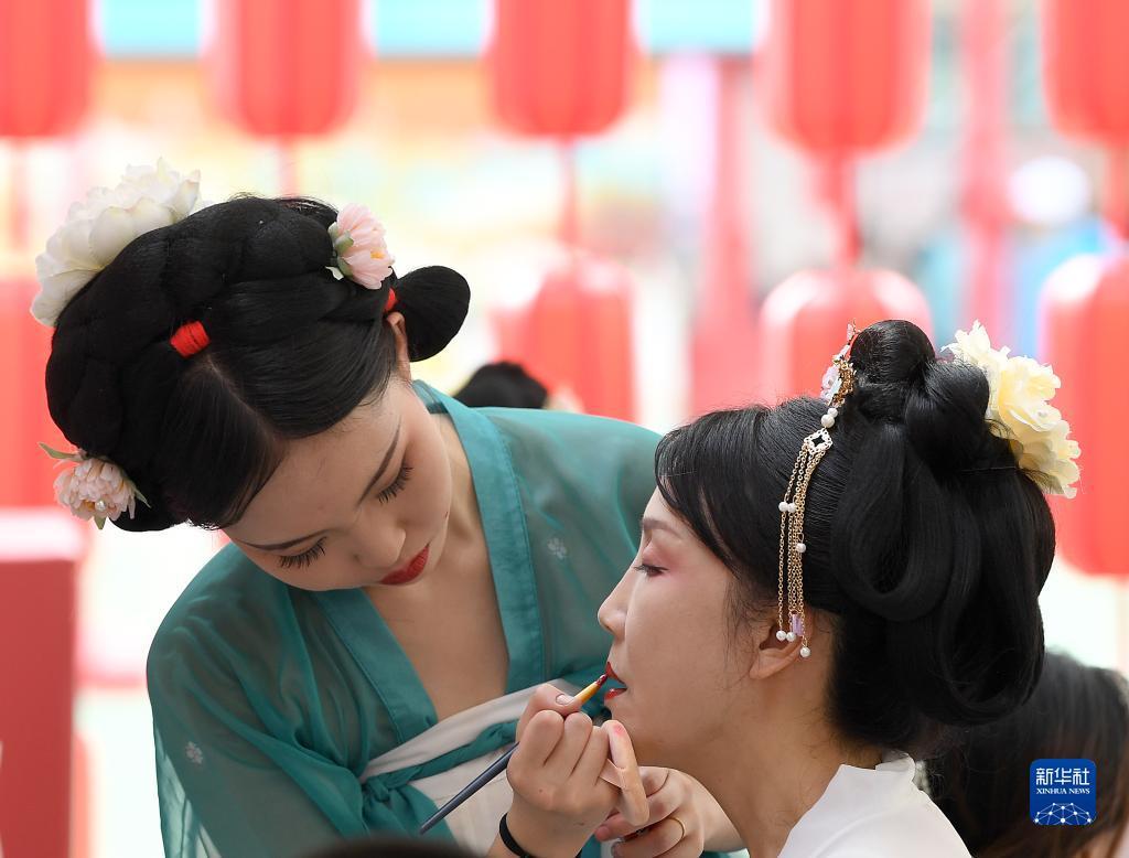 6月30日,市民在陕西西安展区内的唐文化体验区化唐妆。新华社记者 陈铎 摄