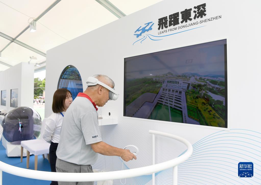 6月30日,香港市民黎先生在粤海水务展区通过VR了解东深供水工程。新华社记者 陈铎 摄