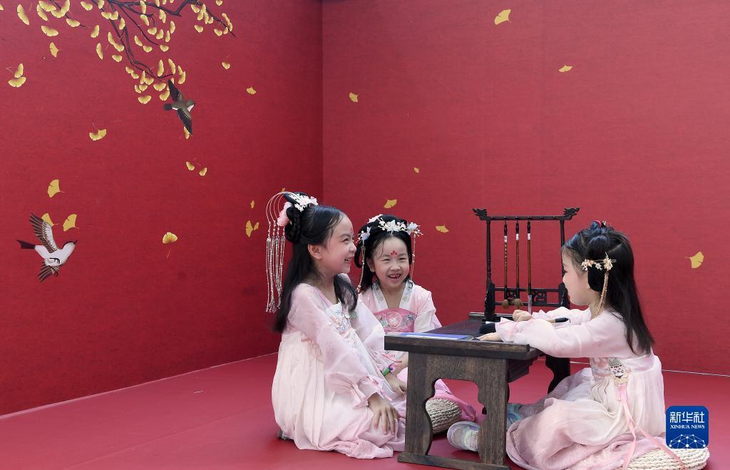 6月30日,三名小朋友在陕西西安展区内的唐文化体验区打卡留影。新华社记者 陈铎 摄