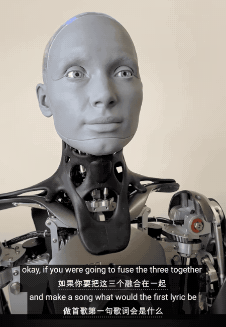 Ameca说自己喜欢爵士古典和电子乐,人类给他出的难题“如果要把这三种风格融合在一起写一首歌,第一句歌词是什么。”