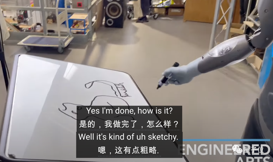 只见它一边与旁边的人类工程师谈笑风生,一边熟练地用马克笔在白板上画出一只简笔的猫。