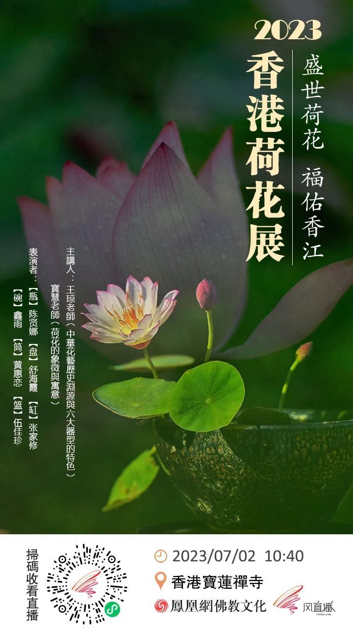 2023年7月2日上午10时40分至12时,凤凰网佛教文化将带您直击宝莲禅寺荷花展现场,赏夏荷盛景,并为您现场直播由李丽淑教授团队带来的中华花艺六大器型插花表演。