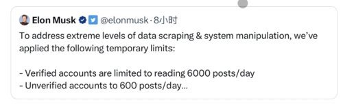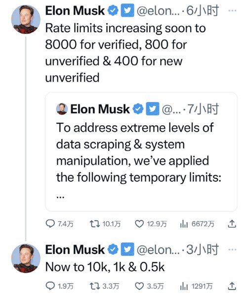 随后,马斯克又提高了可浏览推文量:三种形式的账户分别可浏览1万条、1000条和500条推文。