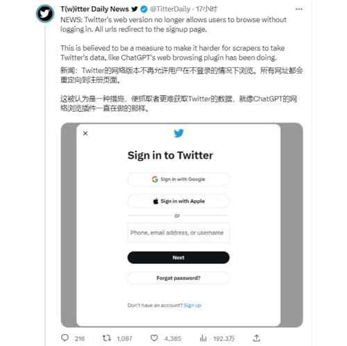 另外还有用户反馈,在未登录推特账户的情况下,无法查看推文内容。对此,推特表示,Twitter的网络版本不再允许用户在不登陆的情况下浏览,所有网址都会重新返回注册页面。