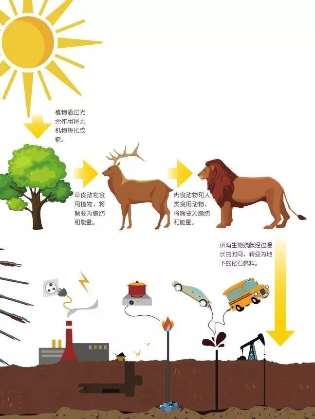 自然界的太阳能板就是植物,植物吸收太阳光来进行光合作用,草食动物吃植物填饱肚子,肉食动物则以其他小型动物为食。动植物死后,它们的残骸与泥土混合,随着地质运动而被深埋在海底或地底,发生了复杂的化学变化,最终转变成了石油、煤等化石燃料,被人类开采出来使用。没有阳光的话,植物无法生存,就不会有化石燃料出现了。