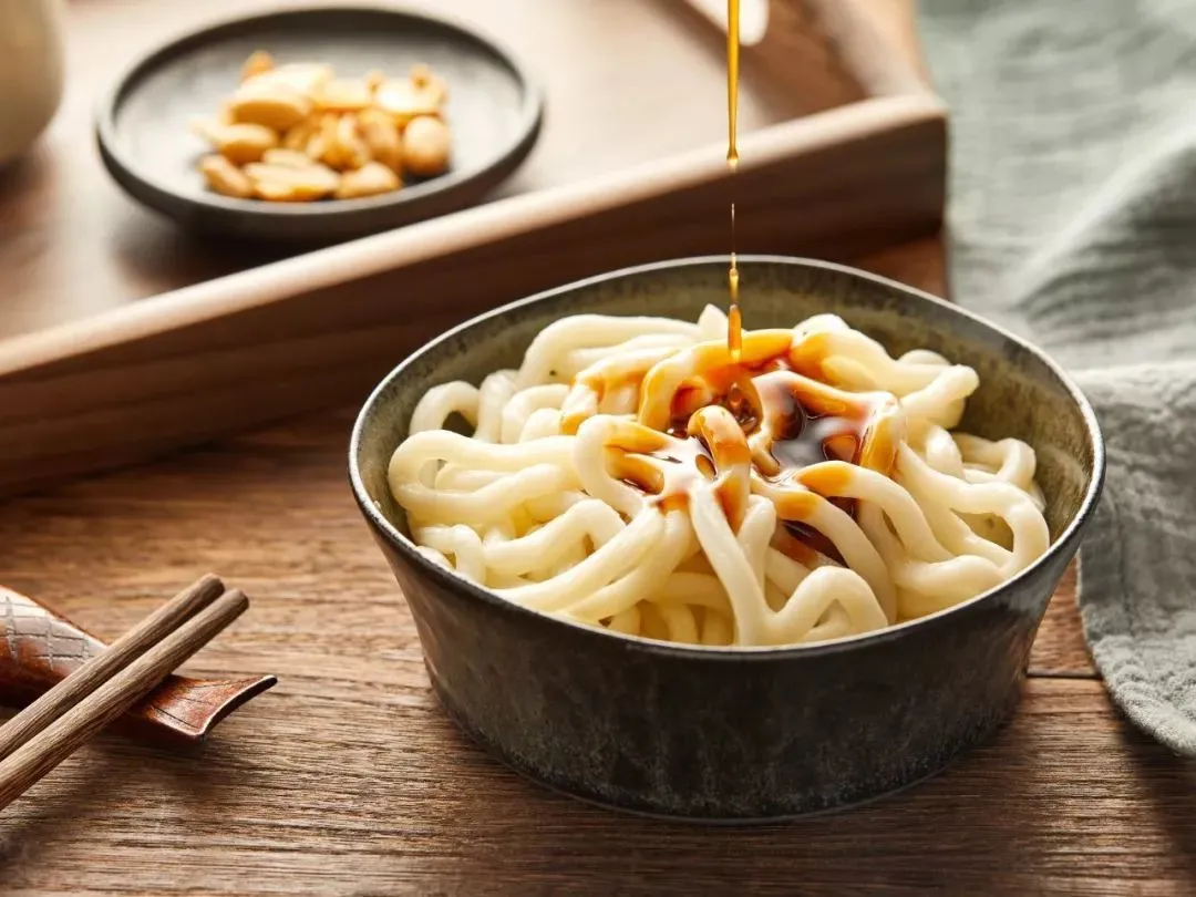煮好就简单了,码在碗里,一勺复制酱油、一勺加了白芝麻的红油辣子、再来点碎花生。吃甜水面是一定要拌匀的,要让每一根都裹上厚厚的一层酱料,这样才能完美的品尝她的精妙。
