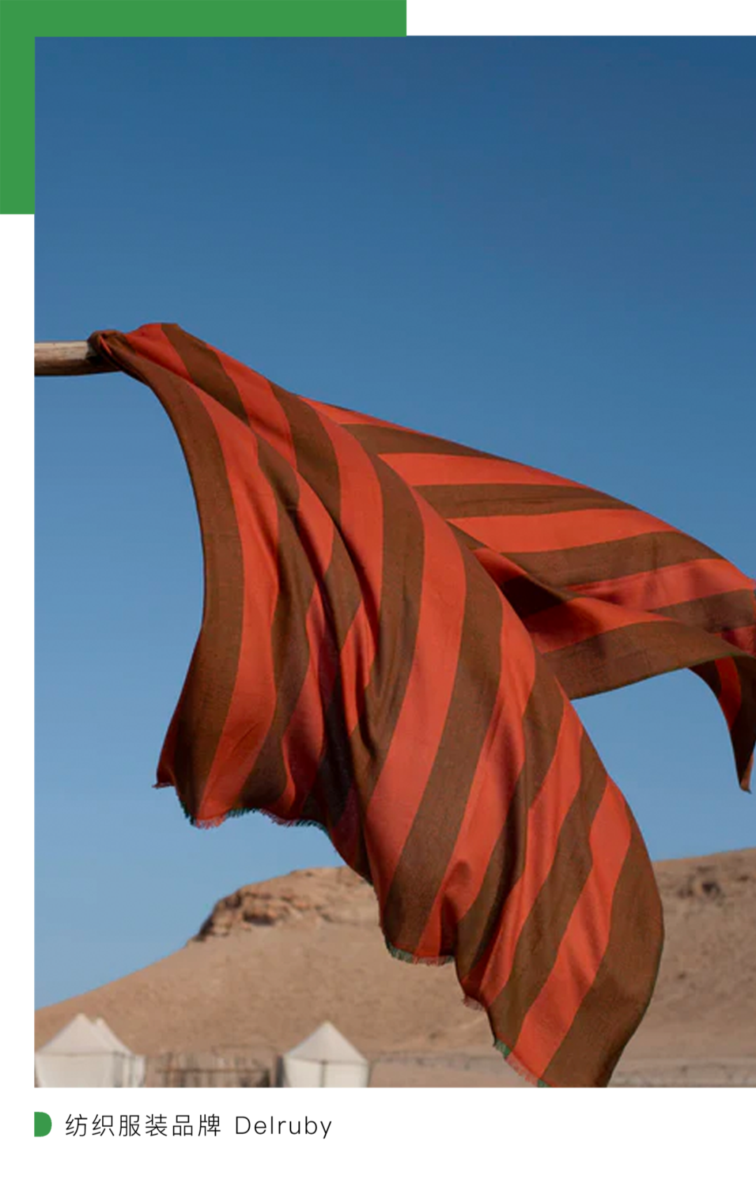 纺织服装品牌 Delruby 的创始人兼设计师 Iris Delruby ,长期以来在传统编织领域上取得过卓越的成就,该品牌的纺织品由羊绒和羊毛等天然纤维制成,相比较合成纤维,该材质对环境的影响更小。为了保障生产的可持续,他们采用传统手工编织设计图案,是大规模机器所难以制作而成的。