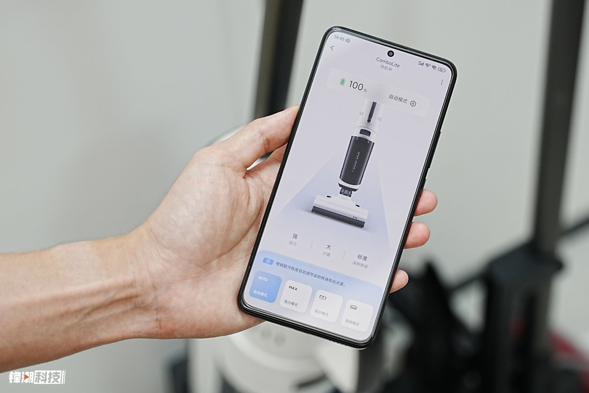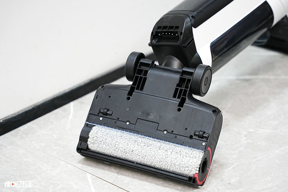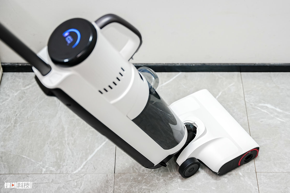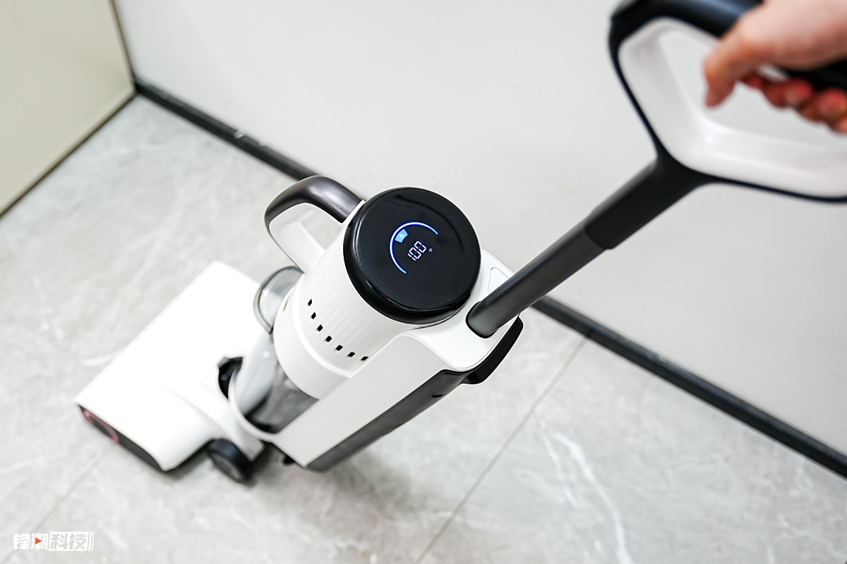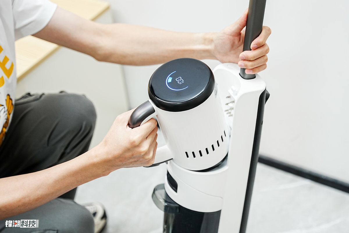 主机上配备一个 LED 彩色显示屏,可以显示电量、网络连接情况以及清洁模式,切换模式时还会有语音提醒,降低了学习的成本,长辈也可以轻松使用。洗地机在使用时,屏幕的显示方向是面向用户的,而当洗地机放回底座进行充电时则会反过来显示,让用户可以更加直观的看到充电情况,这个细节还是做的挺不错的。