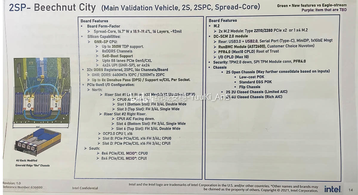 这款处理器的应用平台之一是Beechnut City MVV,它是一款围绕Birch Stream平台设计的双路主板,上面有两个LGA 4710接口,可搭载两颗Granite Rapids-SP处理器,单颗处理器的TDP为350W,上面一共有32个DIMM内存插槽,支持8通道DDR5,内存频率为DDR5-6400 1DPC / DDR5-5200 2DPC,平台最多可提供88条PCI-E 5.0通道。