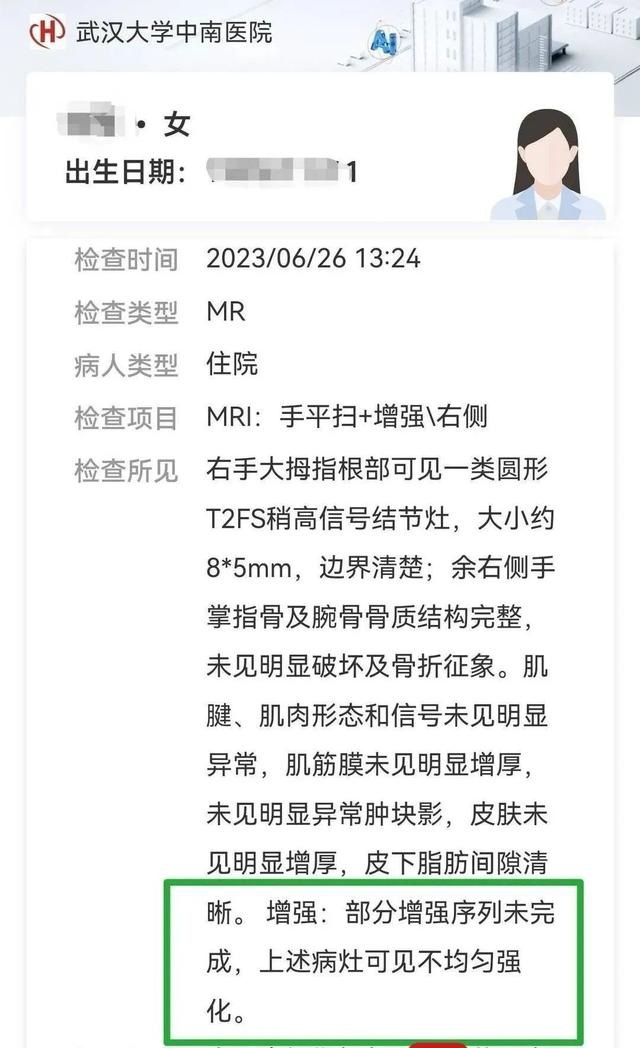 6月26日下午,因右臂长了个疙瘩,李婷在中南医院就诊时,被安排了一次核磁共振检查。