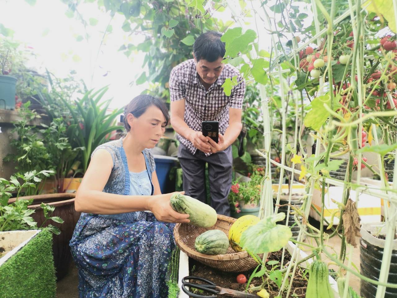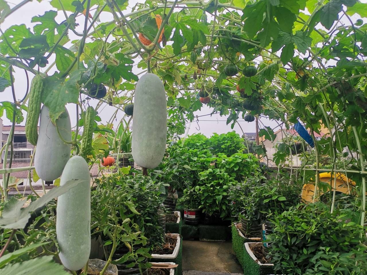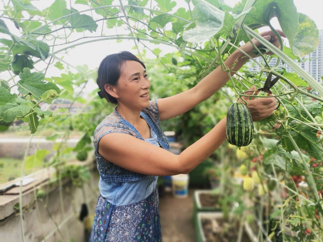 又甜又脆的小西瓜,又绿又红的长辣椒,又圆又香的西红柿,又长又紫的茄子……7月1日,笔者来到徐姐不足一百平方米的空中菜园, 黄瓜、冬瓜、苦瓜,丝瓜等挂满架,西红柿,羊角蜜、小王子等结满枝,瓜田架下,一幅彩色瓜果丰收图跃然眼前。