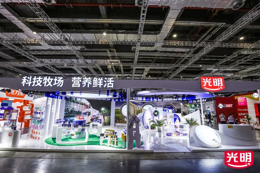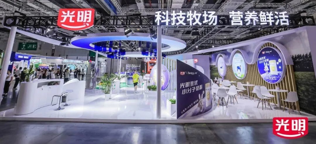 本次展会以"科技牧场、营养鲜活"为设计理念,展位通过巧妙的美陈布置,将光明自有牧场还原至现场:蓝天、白云、青草、奶牛,独特的创意让参展者更身临其境地感受优质奶源的来源地。