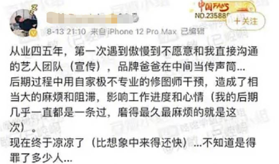 记得张哲瀚塌房的时候,九阳商务就忍不住吐槽其“傲慢”、“影响工作进度和心情”。