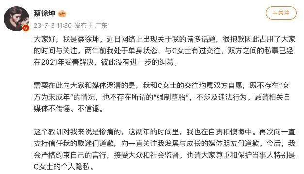 风波之后,蔡徐坤的回应在一周后才姗姗来迟。