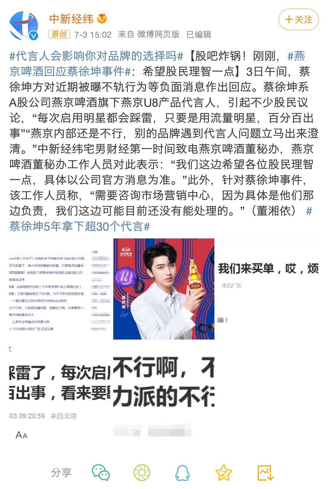 虽然燕京啤酒没有换掉官方微博封面图,但股价波动说明了一切。