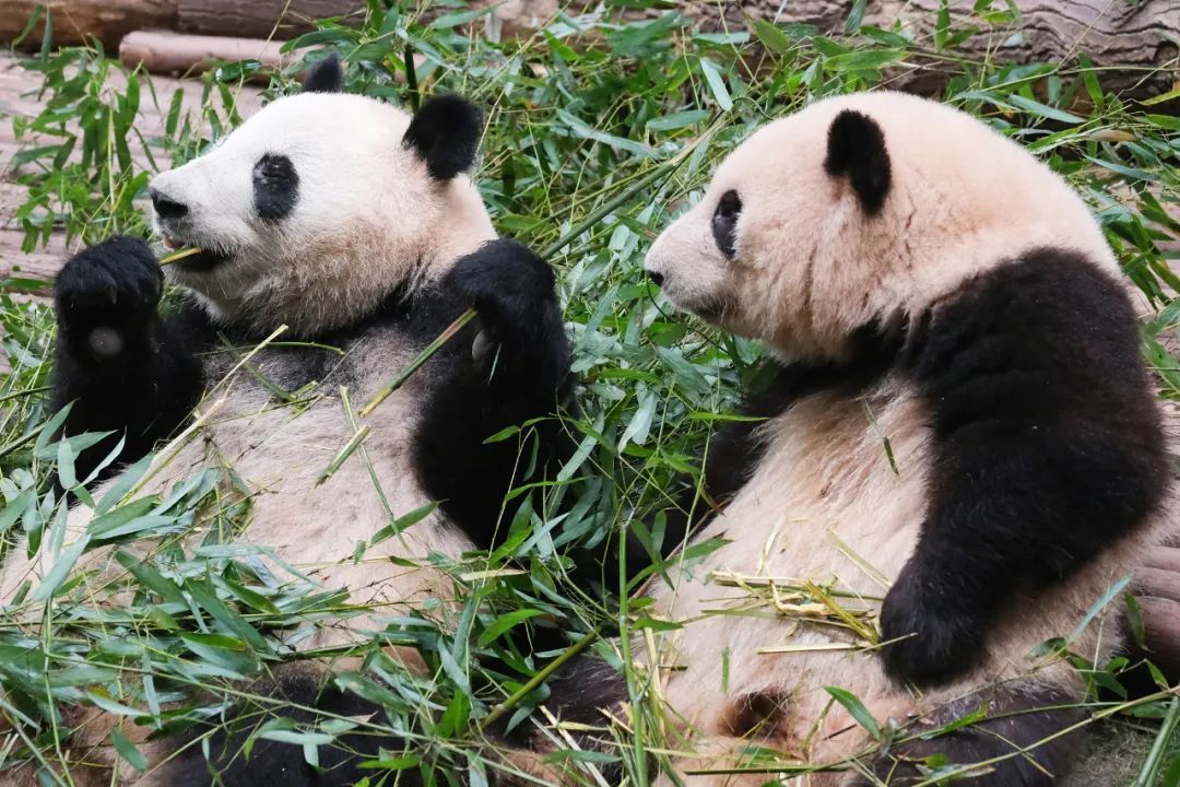 ▲成都大熊猫繁育研究基地,大熊猫和花、和叶早起吃竹子。图源视觉中国
