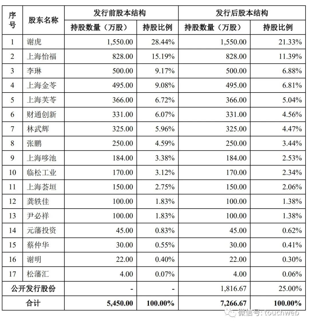 IPO后,谢虎直接持股为21.33%,上海怡福持股为11.39%,李琳持股为6.88%,上海金苓持股为6.81%,上海芙苓持股为5.04%,财通创新持股为4.56%,林武辉持股为4.47%,张鹏持股为3.44%;