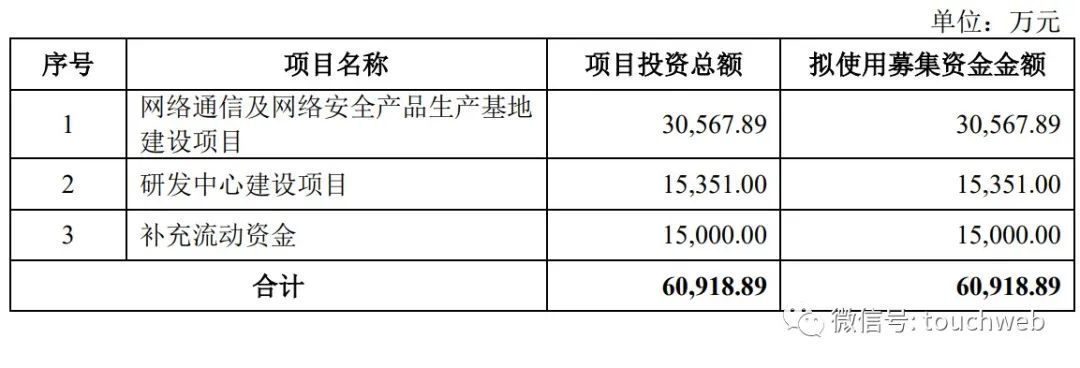 其中,3.06亿元用于网络通信及网络安全产品生产基地建设项目,1.54亿元用于研发中心建设项目,1.5亿元用于补充流动资金。
