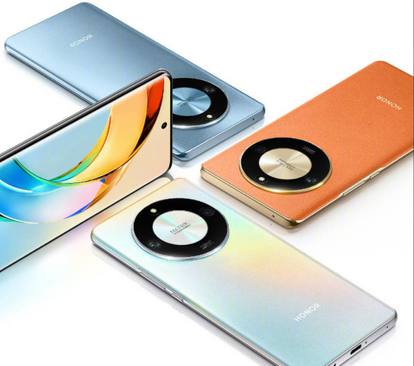外观方面,荣耀X50系列的设计和此前的X40基本采用了同样的设计思路,这款手机提供至少三种不同的配色,分别为白色、蓝色和橙色。与此同时,荣耀X50的后置摄像头模组为星环类设计,模组内包含了三颗后置摄像头和一颗闪光灯。此外,这款手机在正面采用了一块居中打孔的曲面OLED屏幕,目测屏占比很高,正面颜值应该也相当不错。