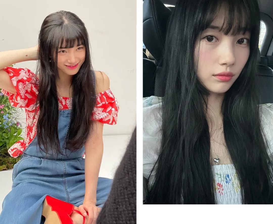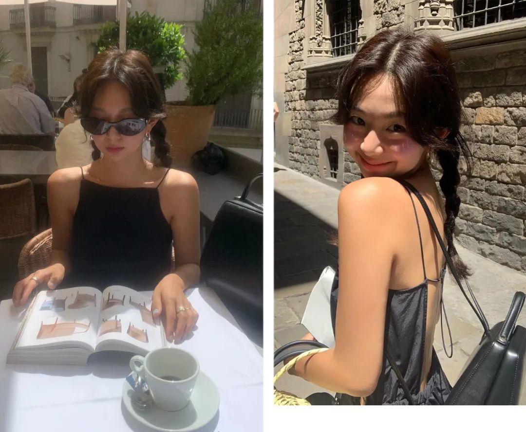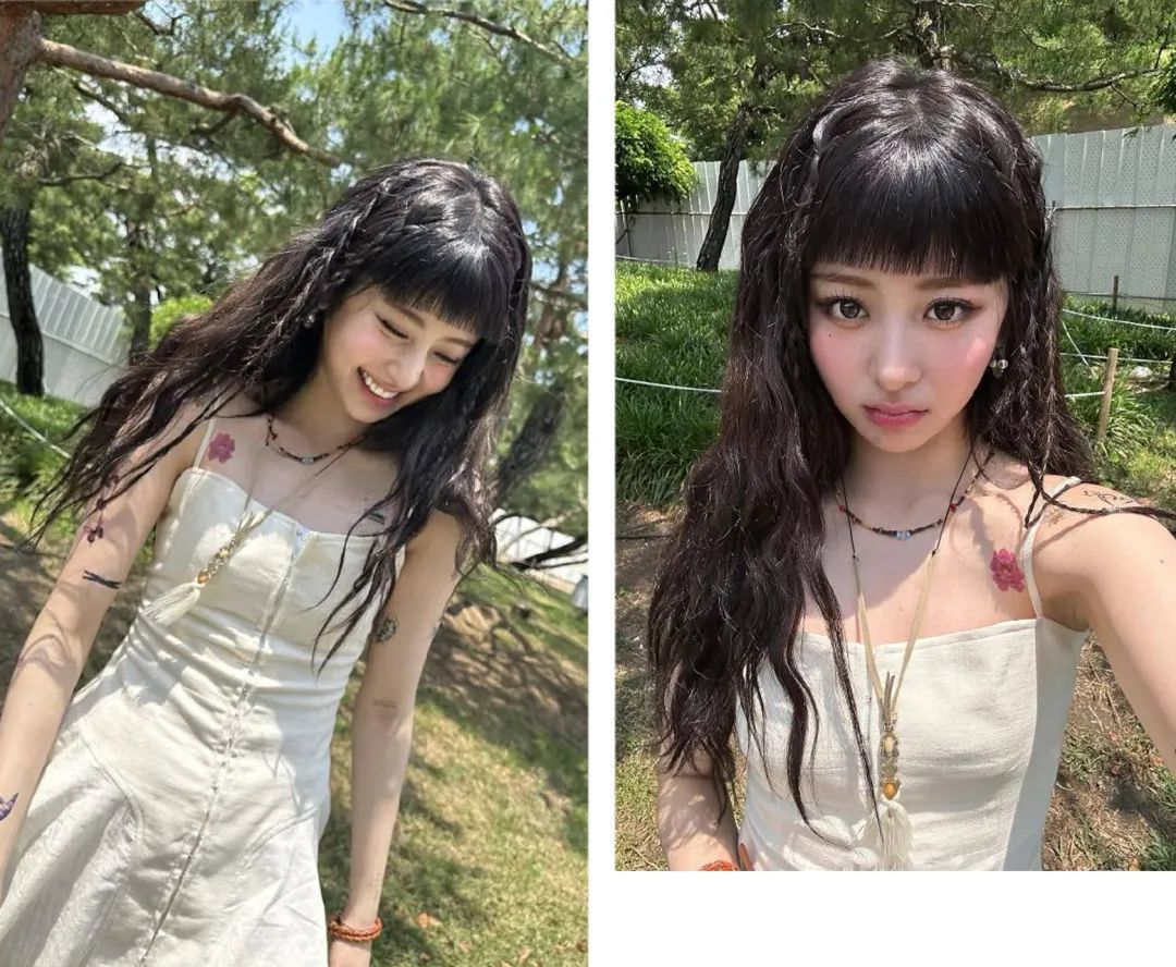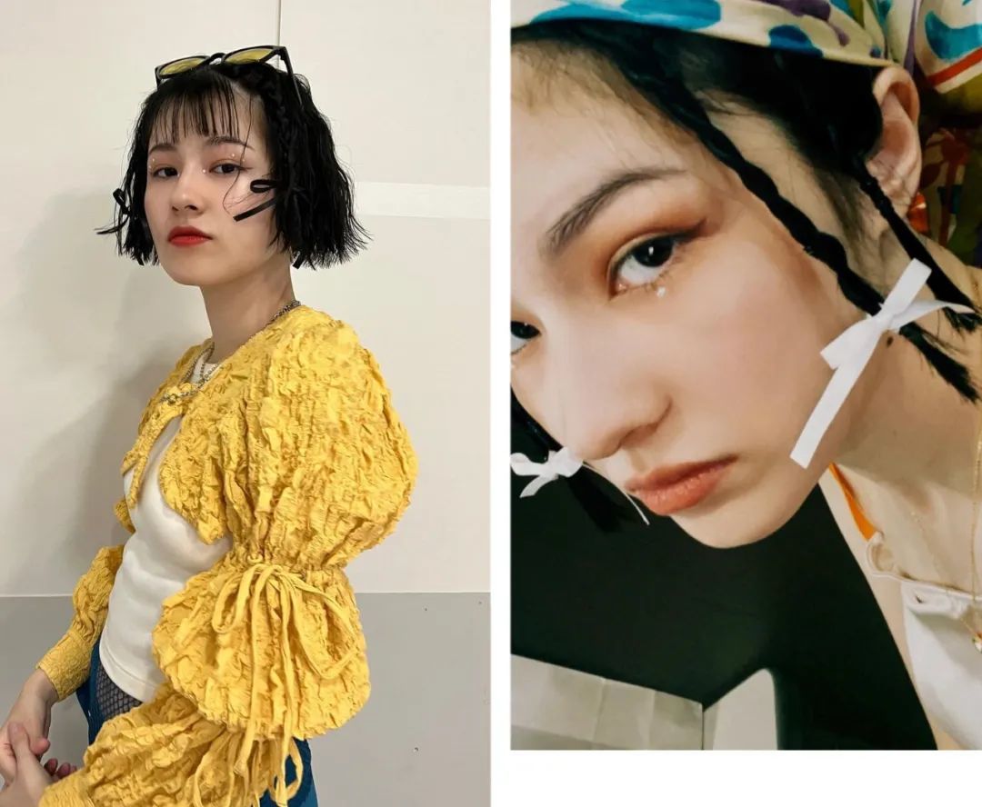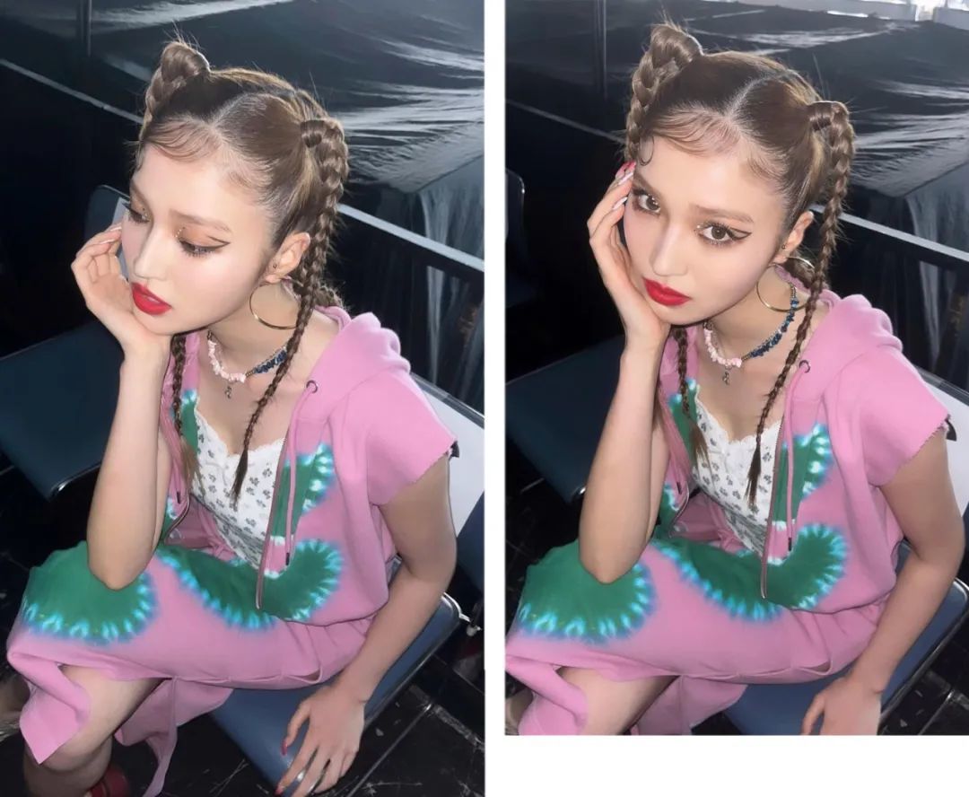 不仅日杂模特,韩国爱豆也超爱!许允真的近照就穿着小吊带裙配这个发型,两侧分别编了两个小辫子,还剪了个齐刘海。
