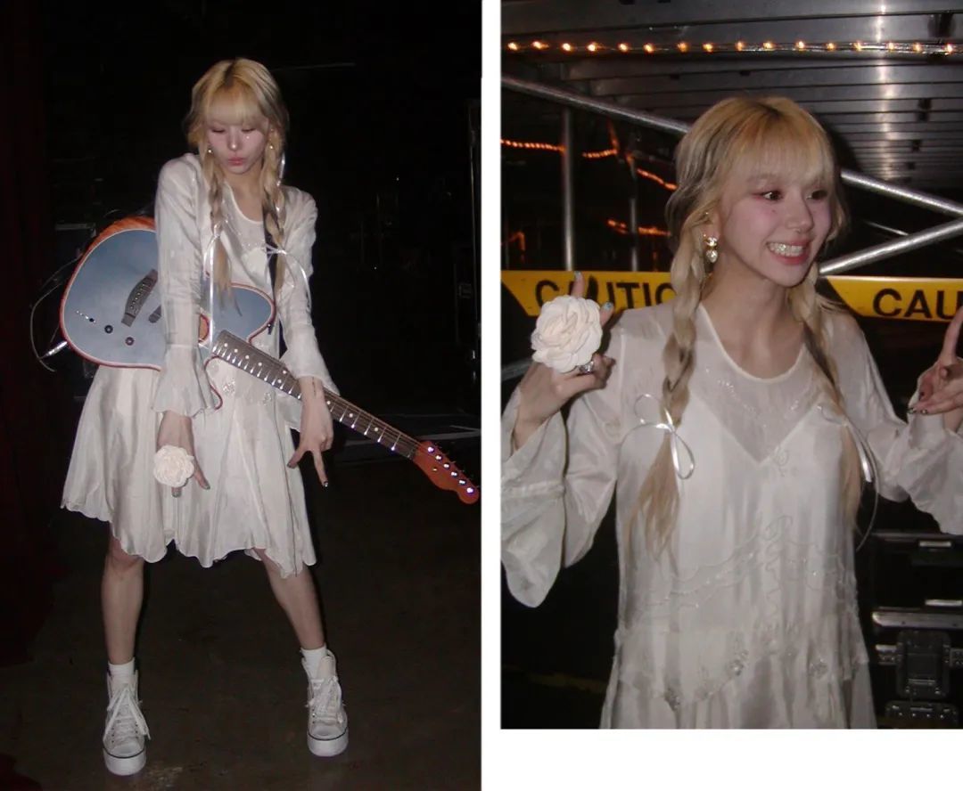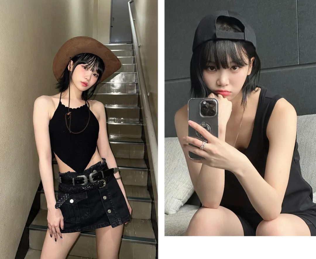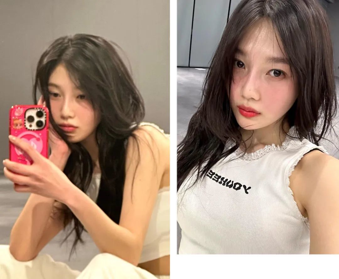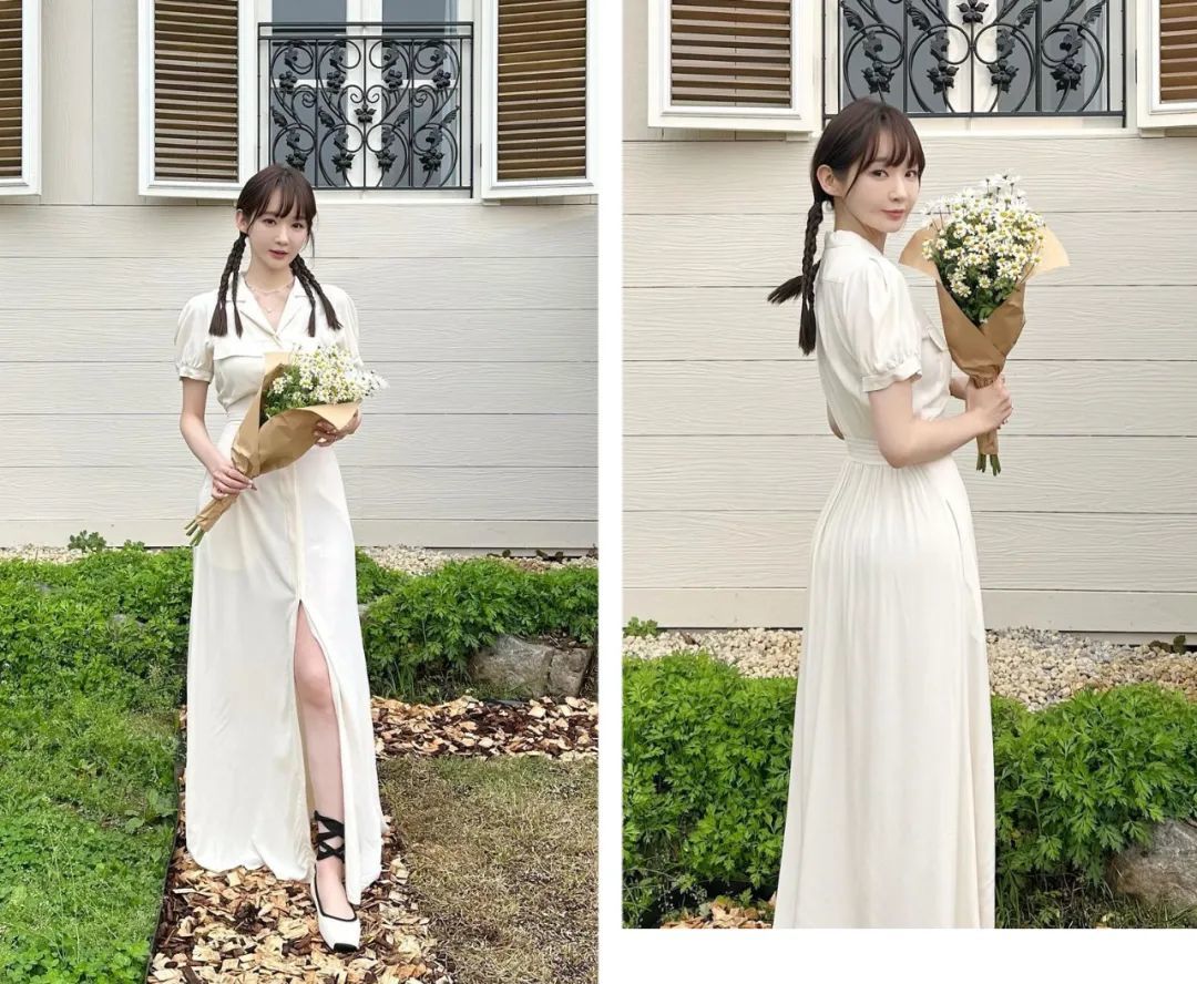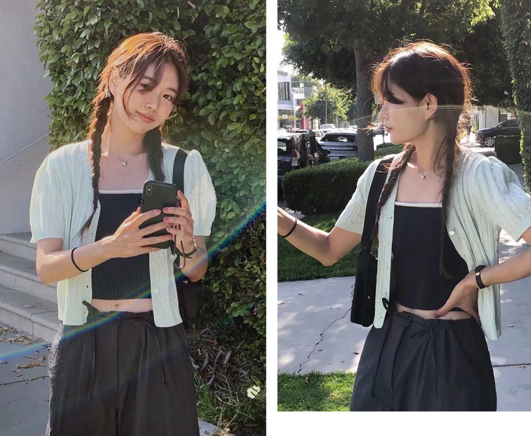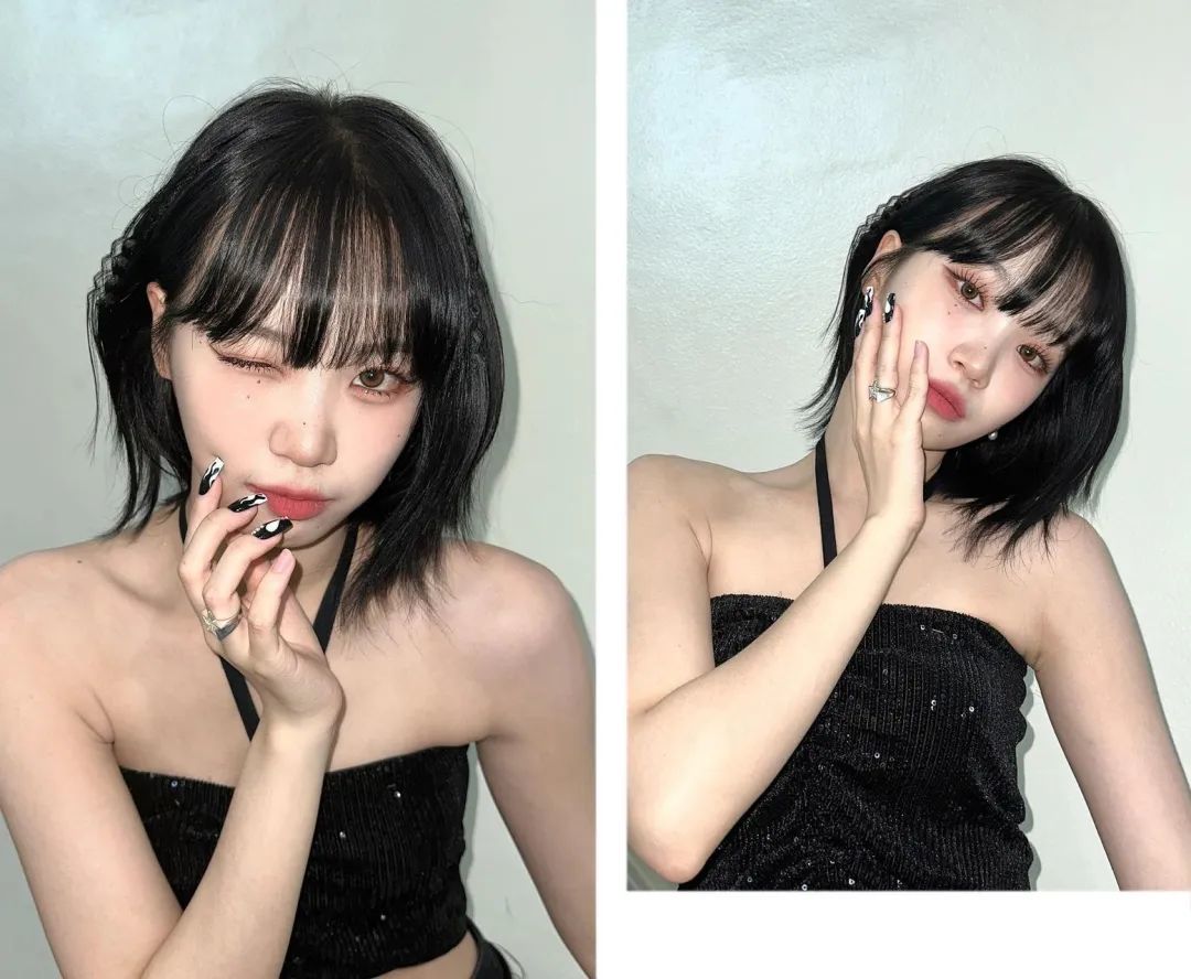 不仅日杂模特,韩国爱豆也超爱!许允真的近照就穿着小吊带裙配这个发型,两侧分别编了两个小辫子,还剪了个齐刘海。