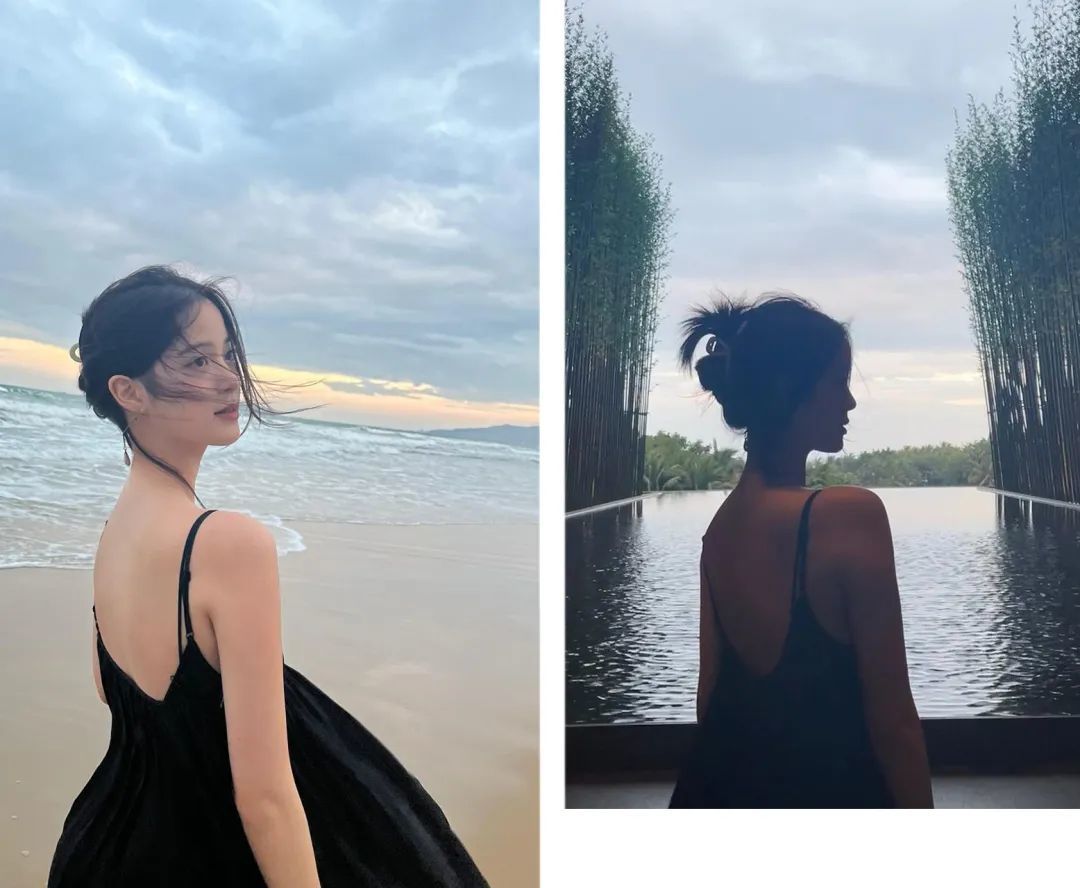 欧阳娜娜在享受度假的时候也是用的鲨鱼夹,配大露背吊带,很美丽呢。