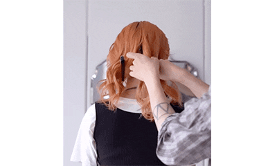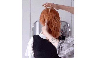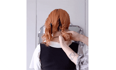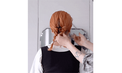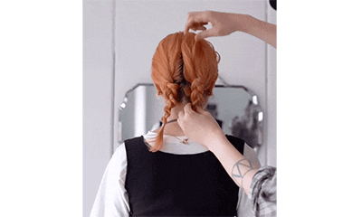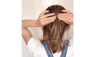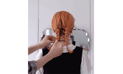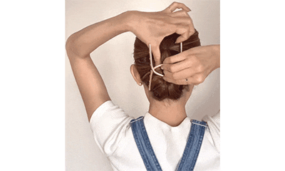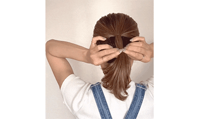 然后看仔细了!将低马尾从上往下翻折,把马尾塞进里面隐藏住。