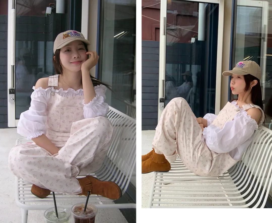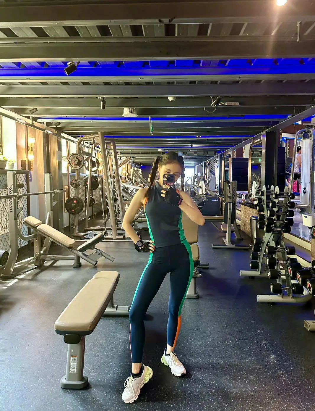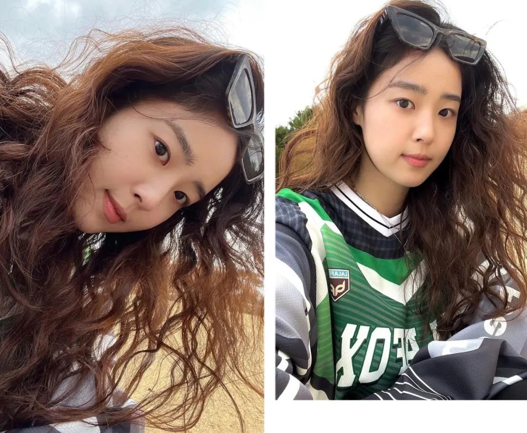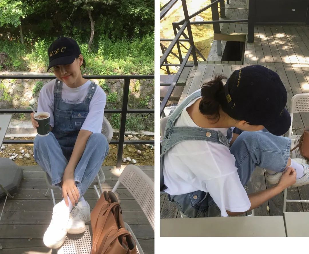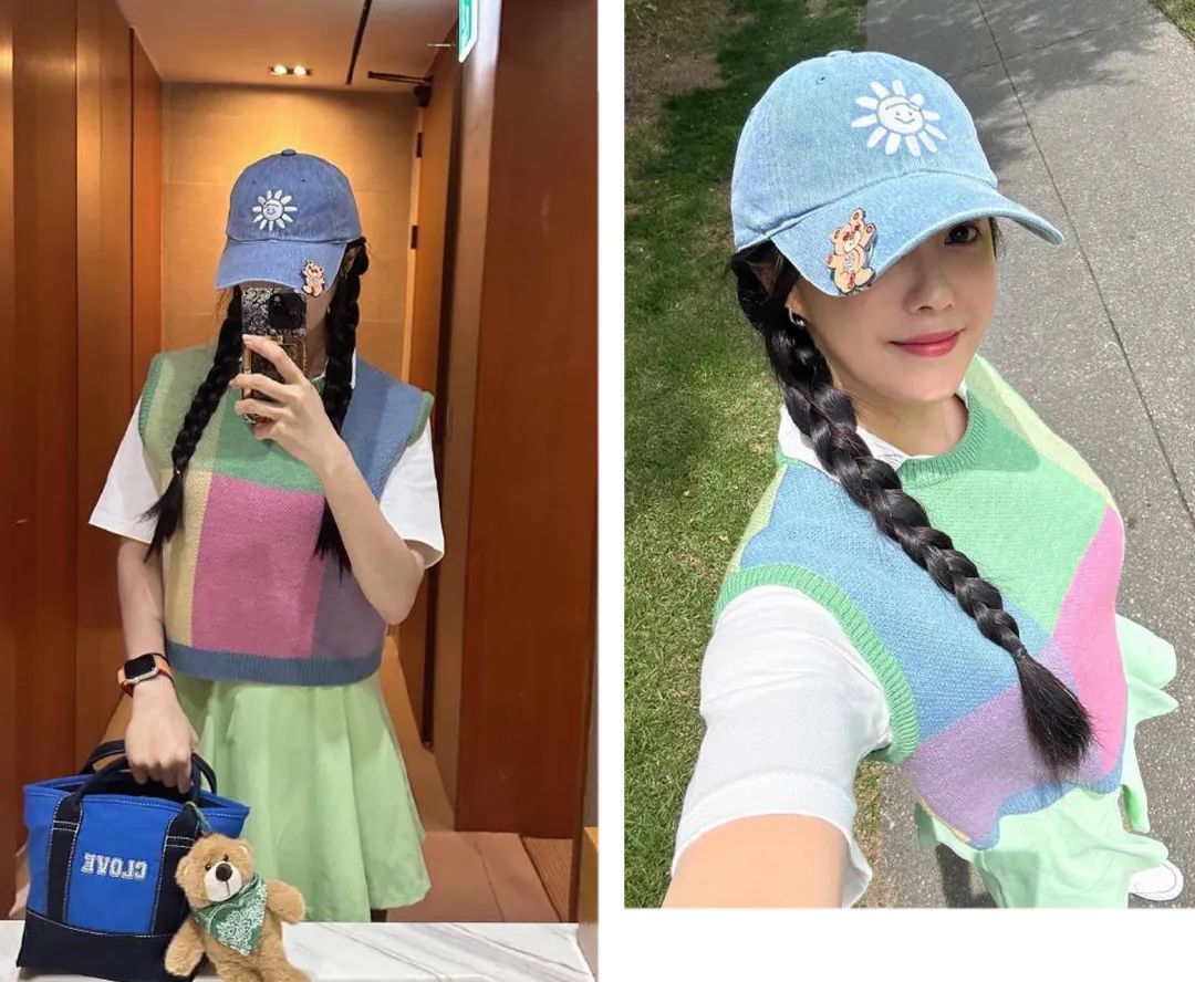 朴孝敏在外出运动时穿了一套多巴胺风look,搭配了一顶浅牛仔色的印花棒球帽。(终于看到了一个扎小辫的。