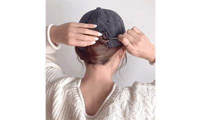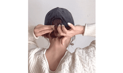 来了!干货又来了!很快,是个10秒快手发型,而且特别适合夏天。先把帽子戴好,然后把头发卷到帽子后方露出的孔处。