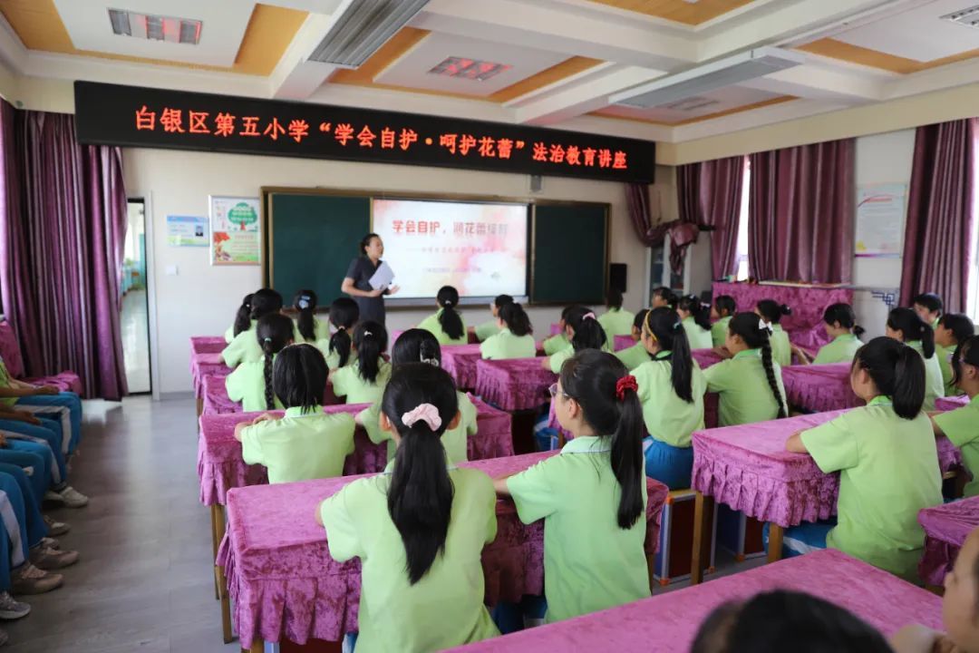 白银区五小邀请的法治副校长是白银区法院90后女干警,她针对自己身边的案例,专门为四、五年级的女同学准备了一堂“学会自护,润花蕾绽放”自我保护专题讲座,包括校园欺凌、未成年性侵害等内容,帮助青春期女学生增强自我保护意识,提高心理素质。在欢快的氛围中,女同学们怀着极高的热情认真听讲,争相举手回答提问,畅所欲言,对平时羞于讨论的话题真诚坦然地交流、沟通。