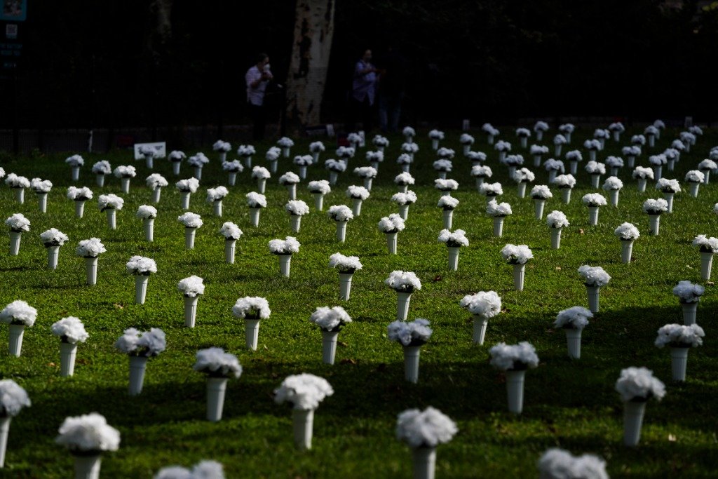 这是2021年10月8日在美国纽约炮台公园内拍摄的为悼念枪支暴力遇难者摆放的白色瓶花。新华社记者王迎摄