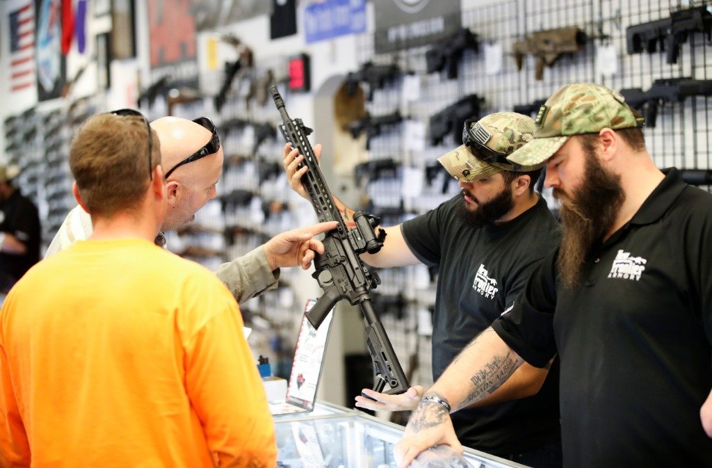 2017年10月4日,在美国拉斯维加斯的“新前线”枪械商店,店员为顾客展示枪支。新华社记者王迎摄