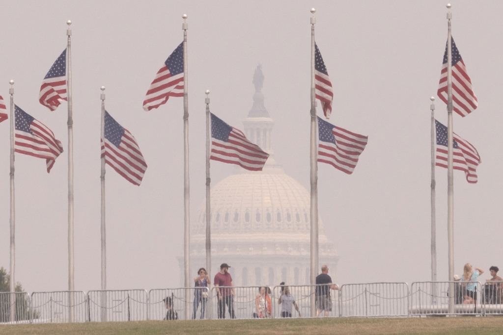6月29日,在美国首都华盛顿,游客在华盛顿纪念碑游览,远处的国会大厦笼罩在烟雾中。新华社发(亚伦摄)
