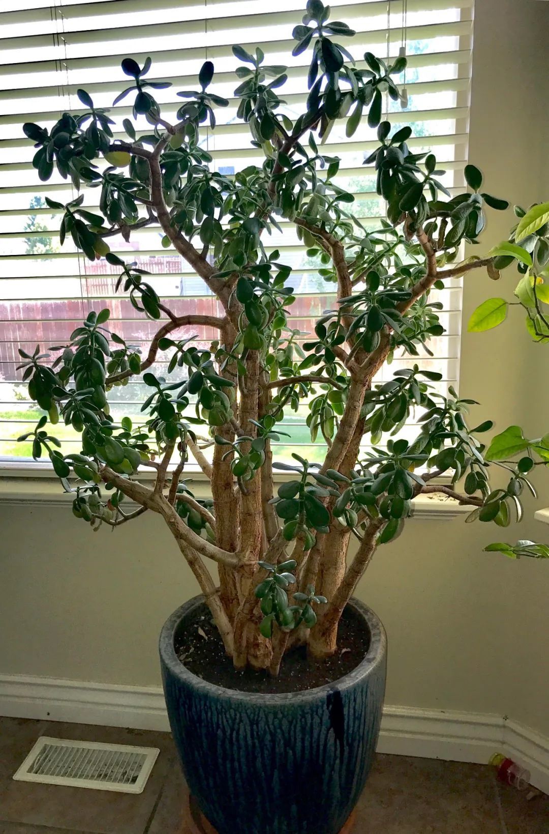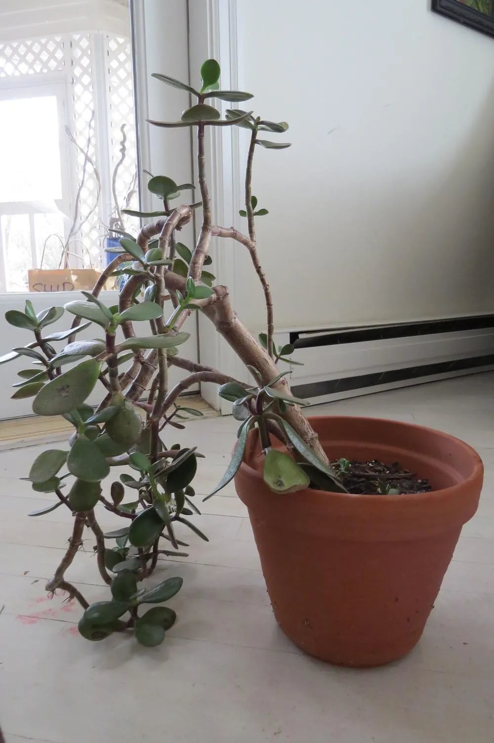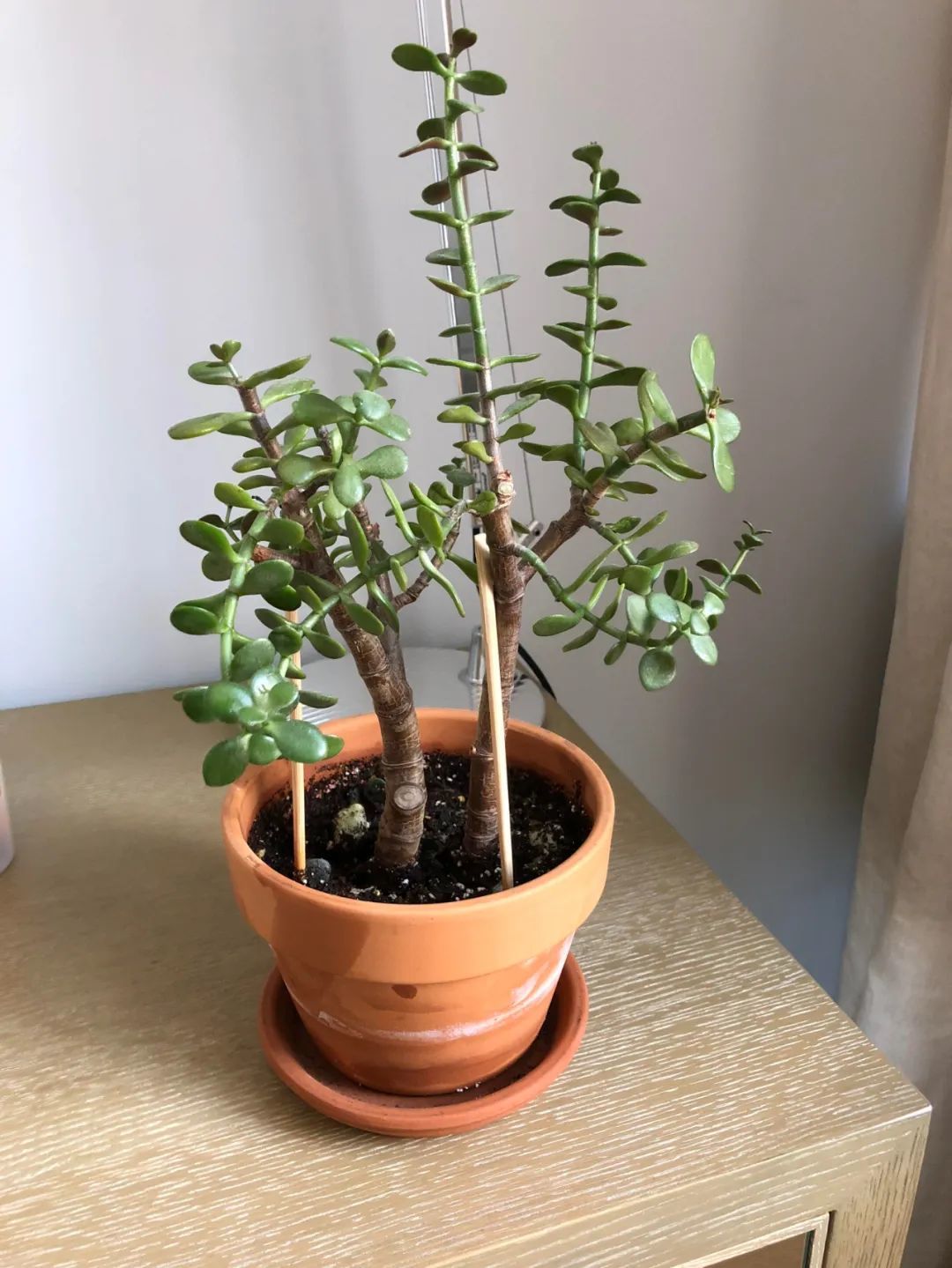 玉树盆栽修剪前后对比(长歪的枝条可以缓慢扶正)