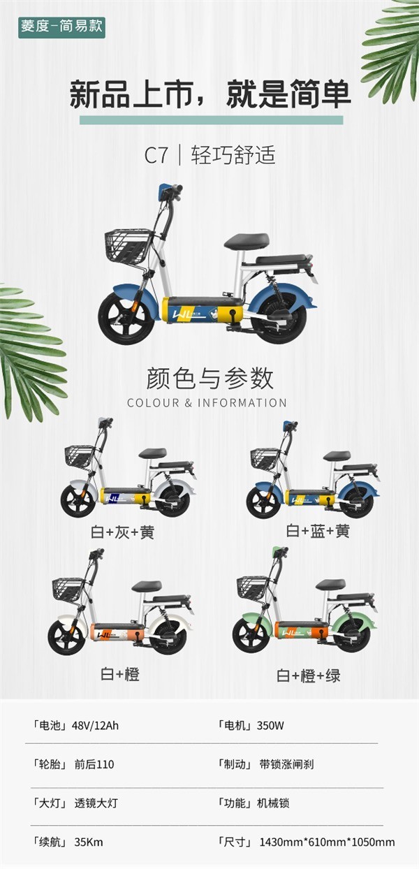 其中,C7是基础型号,尺寸为14306101050毫米,配备350W电机和48V 12Ah电池,续航里程达35公里。该车还配置有透镜大灯,并提供四种配色方案。